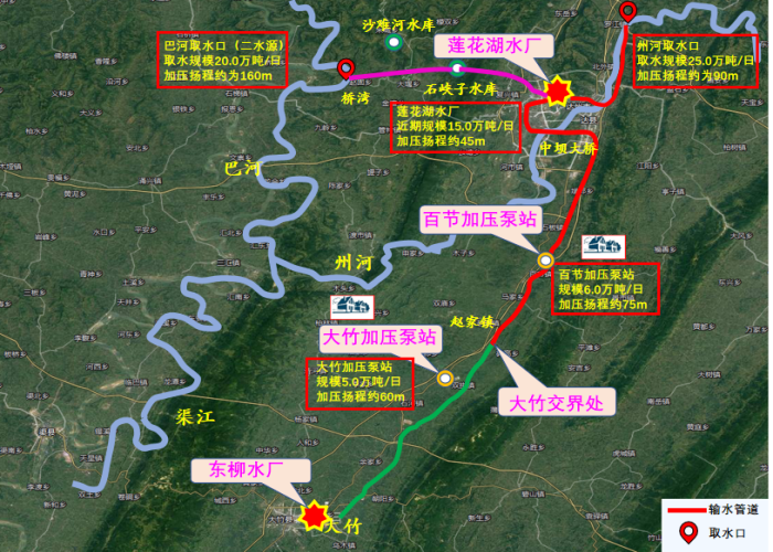 由達(dá)州水務(wù)集團(tuán)負(fù)責(zé)實(shí)施的“引水入竹”達(dá)州段項(xiàng)目,從巴河取水,輸水至蓮花湖水廠,管線途經(jīng)達(dá)川區(qū)、通川區(qū)和高新區(qū),終至大竹交界處,輸配水管道101公里,全程三次加壓總揚(yáng)程280米,總投資12.2億元。